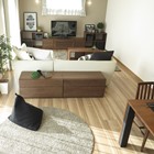 大容量の収納力を備える大型テレビボードを提案!さらにテーブル上のライトに合せてツートンスタイルを提案