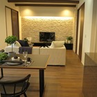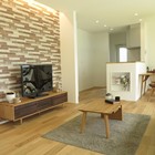 レンガ調のアクセントクロスに合わせてナチュラルカラーの家具とブラック、グレー色を取入れる