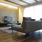 ダークグレーのアクセントクロスを大胆に貼ったLD空間をネイビーとブラックをアクセントにしてコーディネート